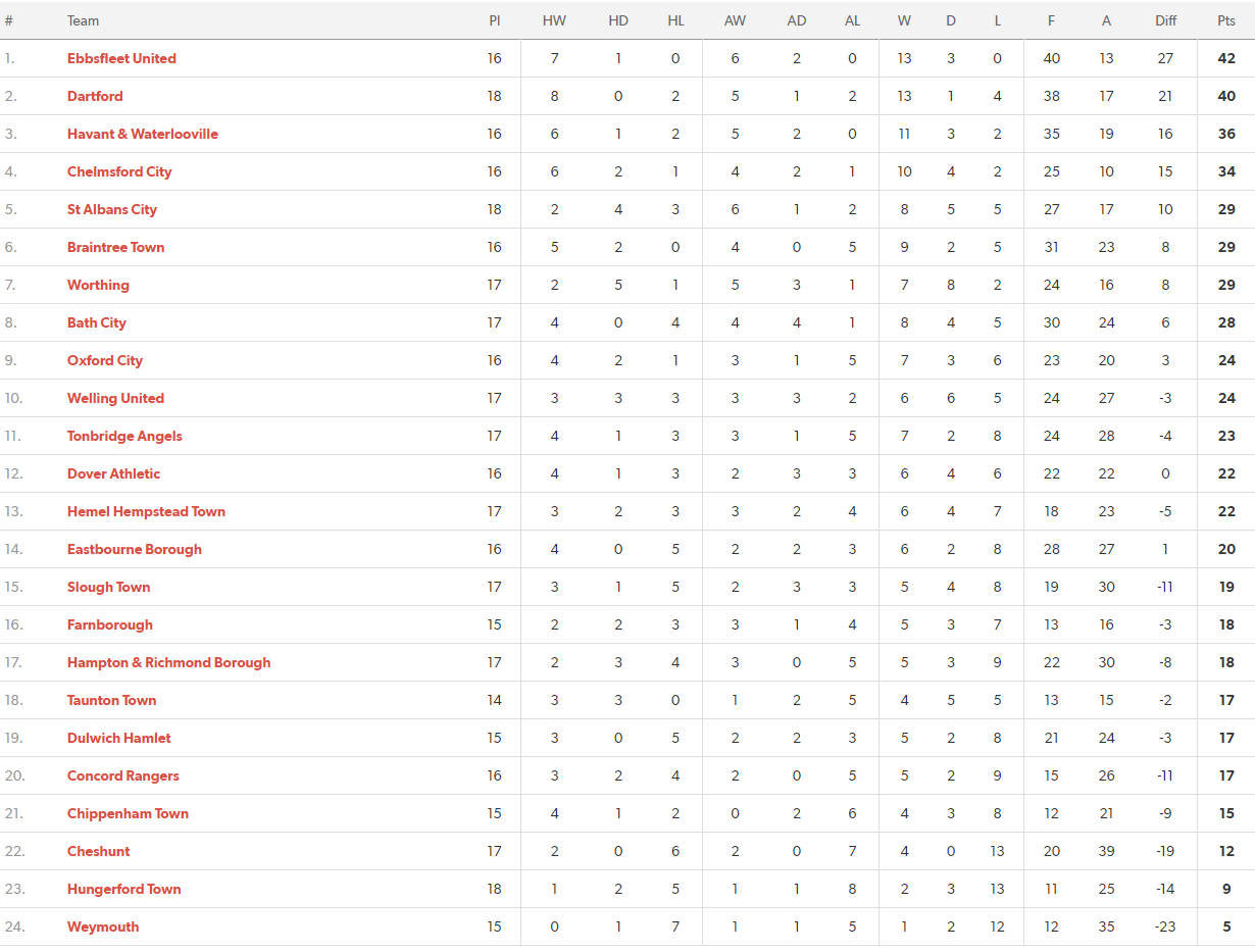 Chelmsford City continue to lead the way in terms of Essex sides, Braintree are seven points behind them but only two places below them, Concord Rangers latest burst of form has seen them pick up nine points in just over a week to climb out of the bottom places, Cheshunt remain in bottom three although will be buoyed by that comeback win against Chippenham Town.
